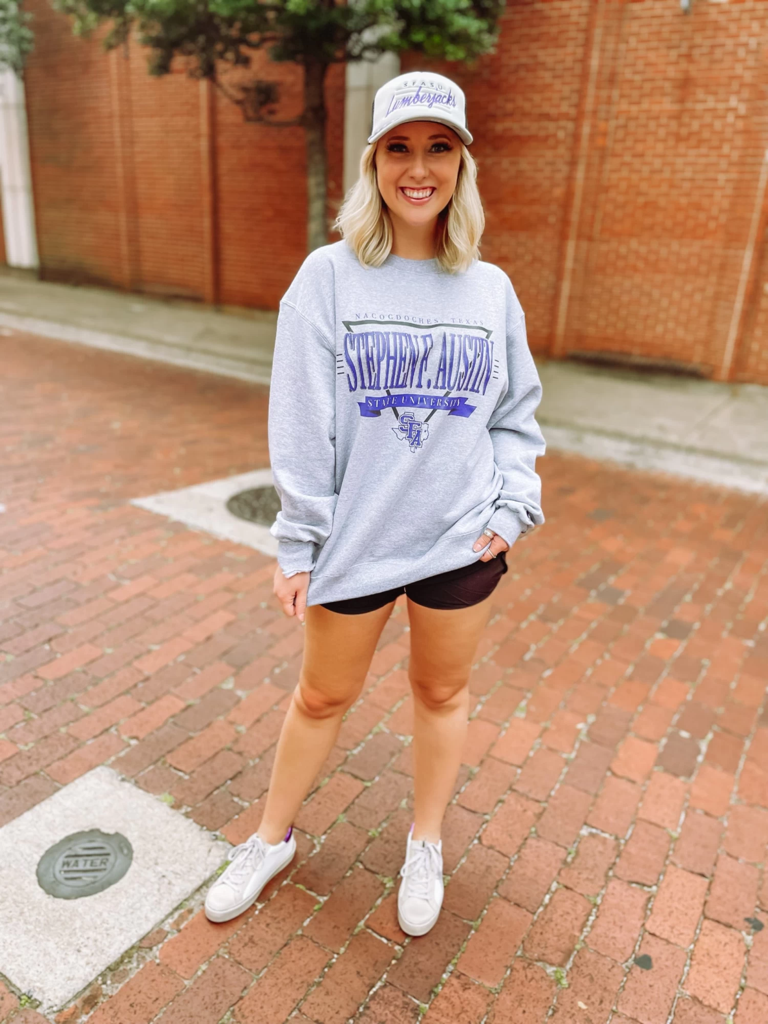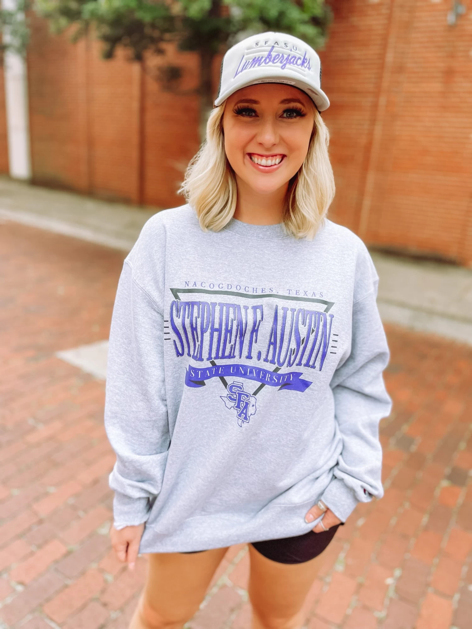 SFA swag meets Champion sweatshirt! Truly a Lumberjacks’ must have item! We love the classic design for a retro feel! Perfectly paired with leggings, vest, and boots OR oversized with shorts! Snag now for ultra comfort đ Perfectly paired with our Sonia Fitted Athletic Shorts and SFASU Lumberjacks Laguna Trucker Hat.