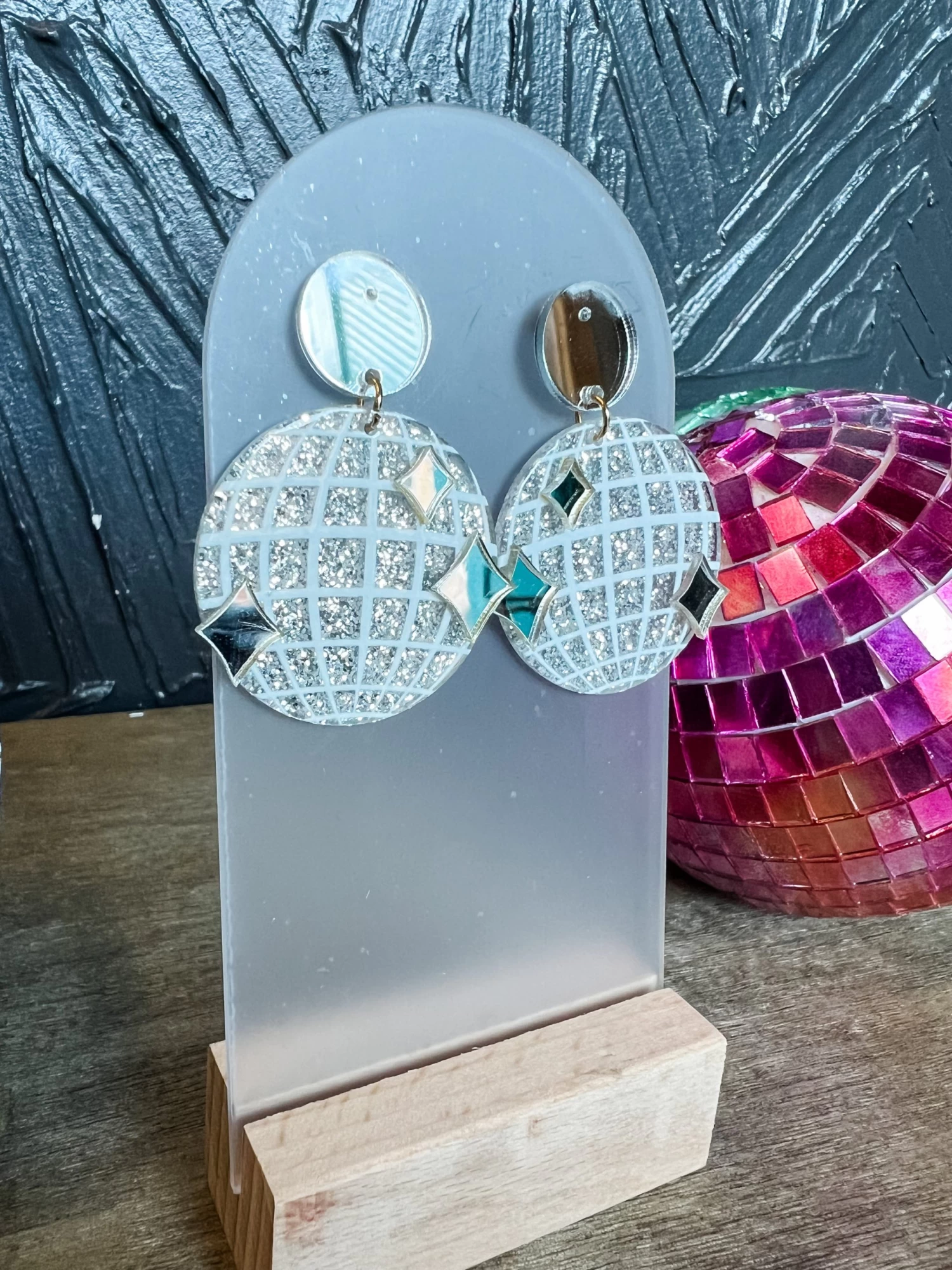 Let your style shine with these dazzling disco party earrings! Crafted from silver and sparkle, these earrings will add the finishing touch to any outfit. It’s time to hit the dance floor and show off your moves in style!