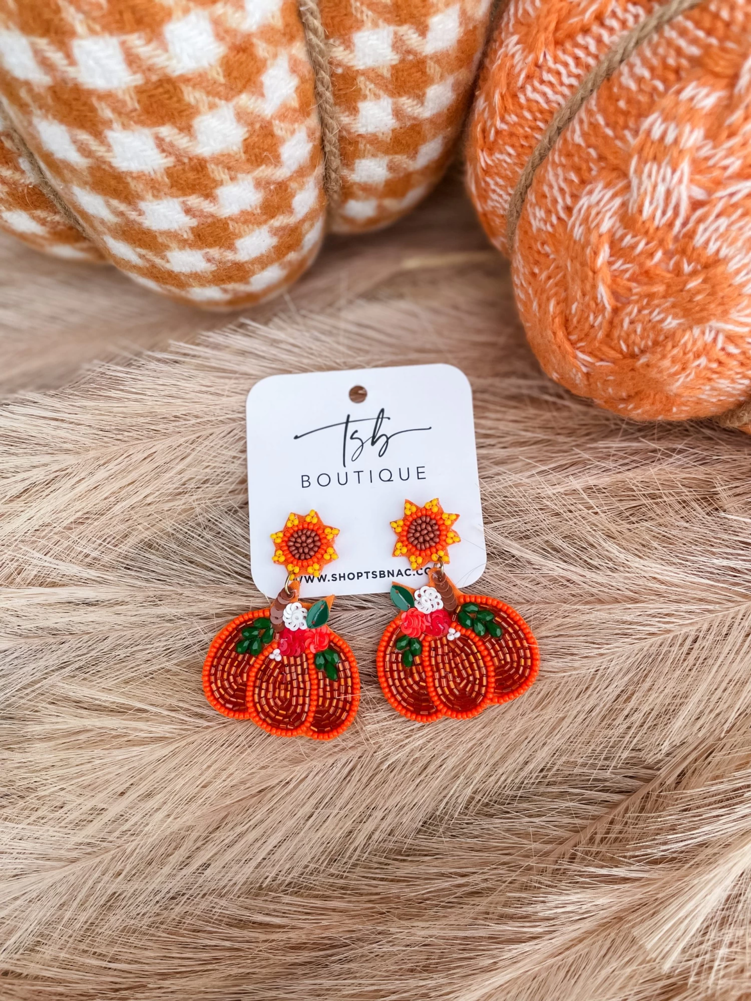 Meet the cutie new Flower Pumpkin Beaded Earrings! Showcasing orange beads in a pumpkin design + a soft felt backing. These are perfect for everyday wear and can jazz up any look!