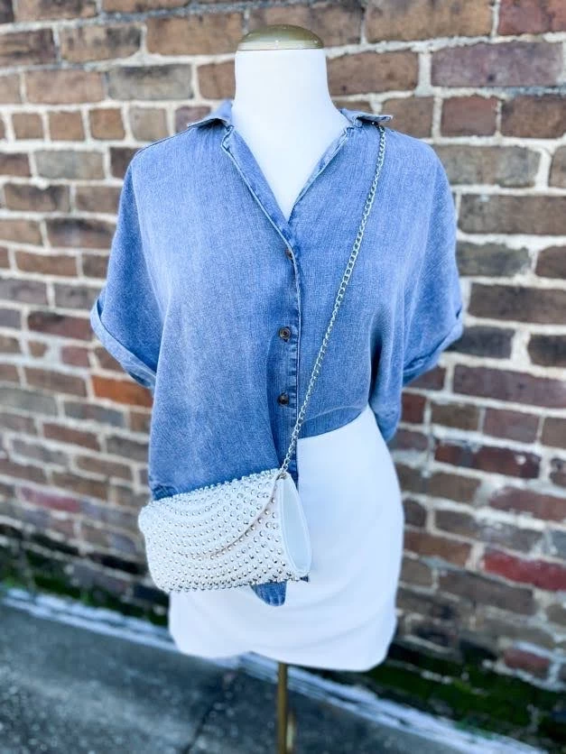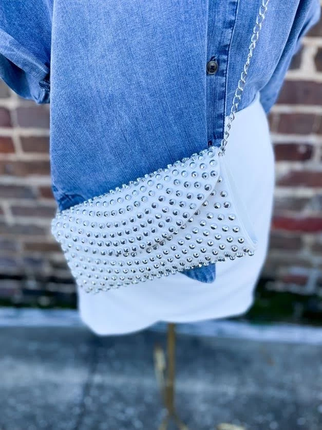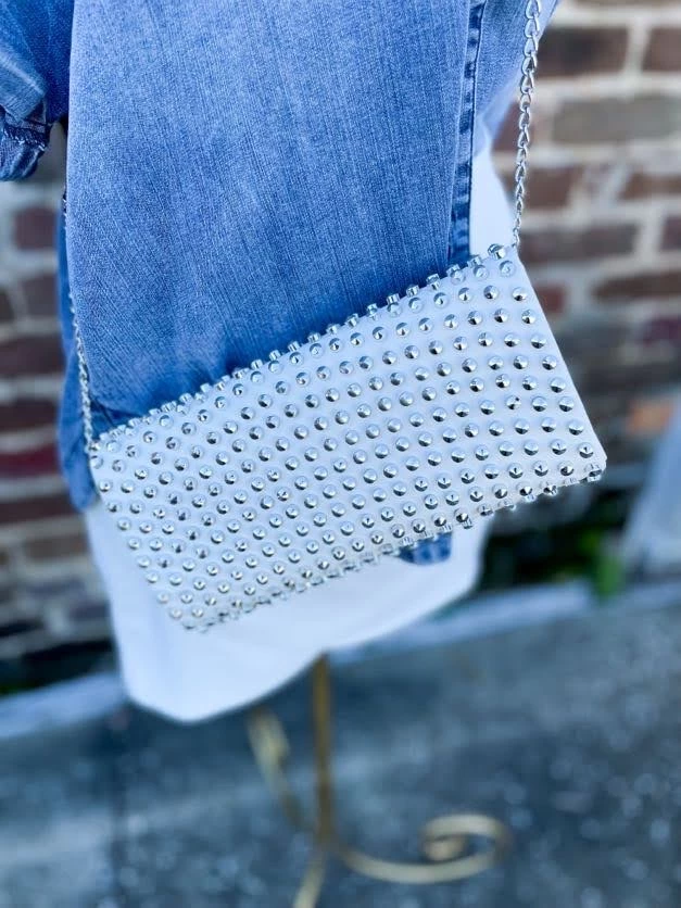 Buy ! The ! Bag ! This edgy accessory is 3quipped with a removable crossbody strap and has a snap button closure. Finishing with fun stud details for a chic look! Tell the hubby, tell your gals, this is the bag you need!