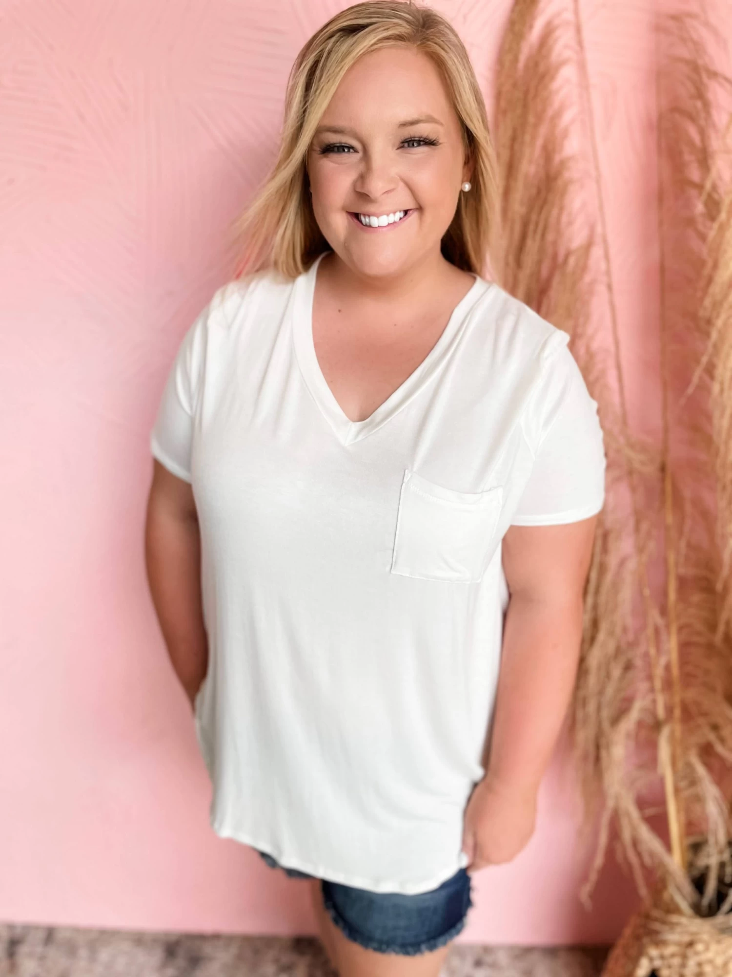 Brooke is wearing a 1X. She is 5’5. Bust size 44. Bra size 40D. Pant size 16.