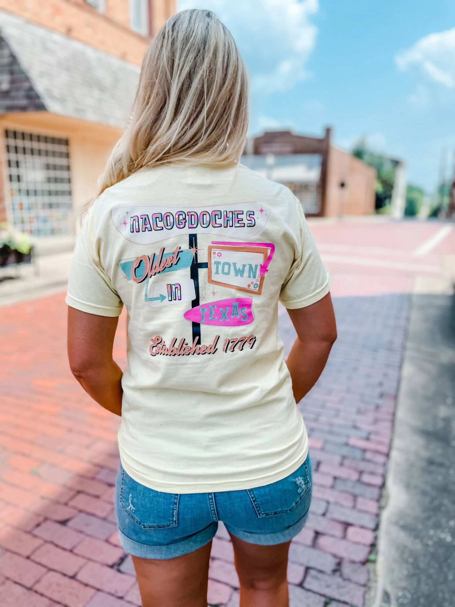 Oldie but a goodie, our dear Nacogdoches is the oldest town in Texas! This diner design is by far a huge team favorite! Featured on a Comfort Colors tee is our retro design ~ the best gift for any Nac resident, visitors, and just because it’s so cute!