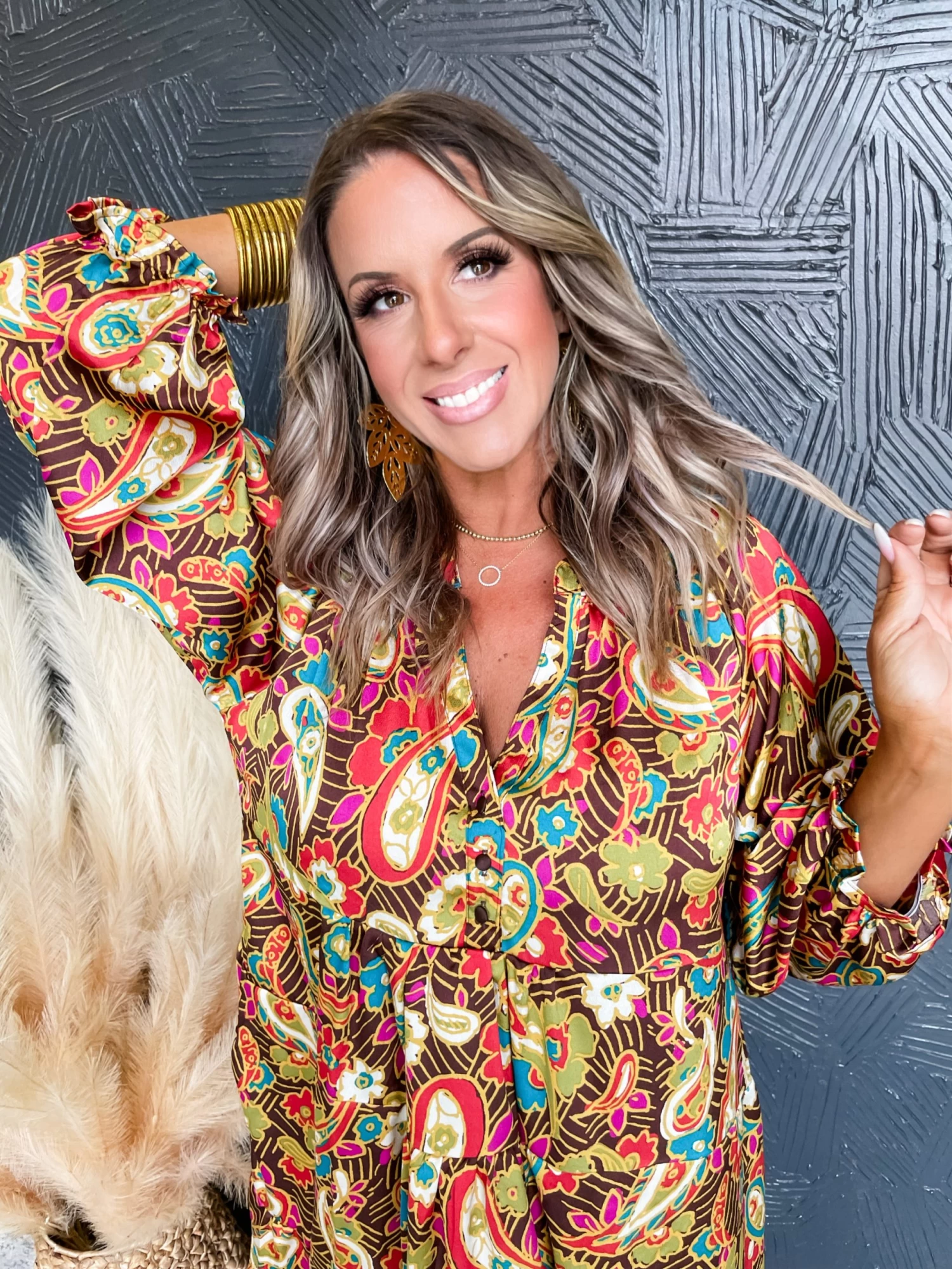 Lesly is wearing a Large. She is 5’6. Bust size 36. Bra size 36D. Pants size 9-11.