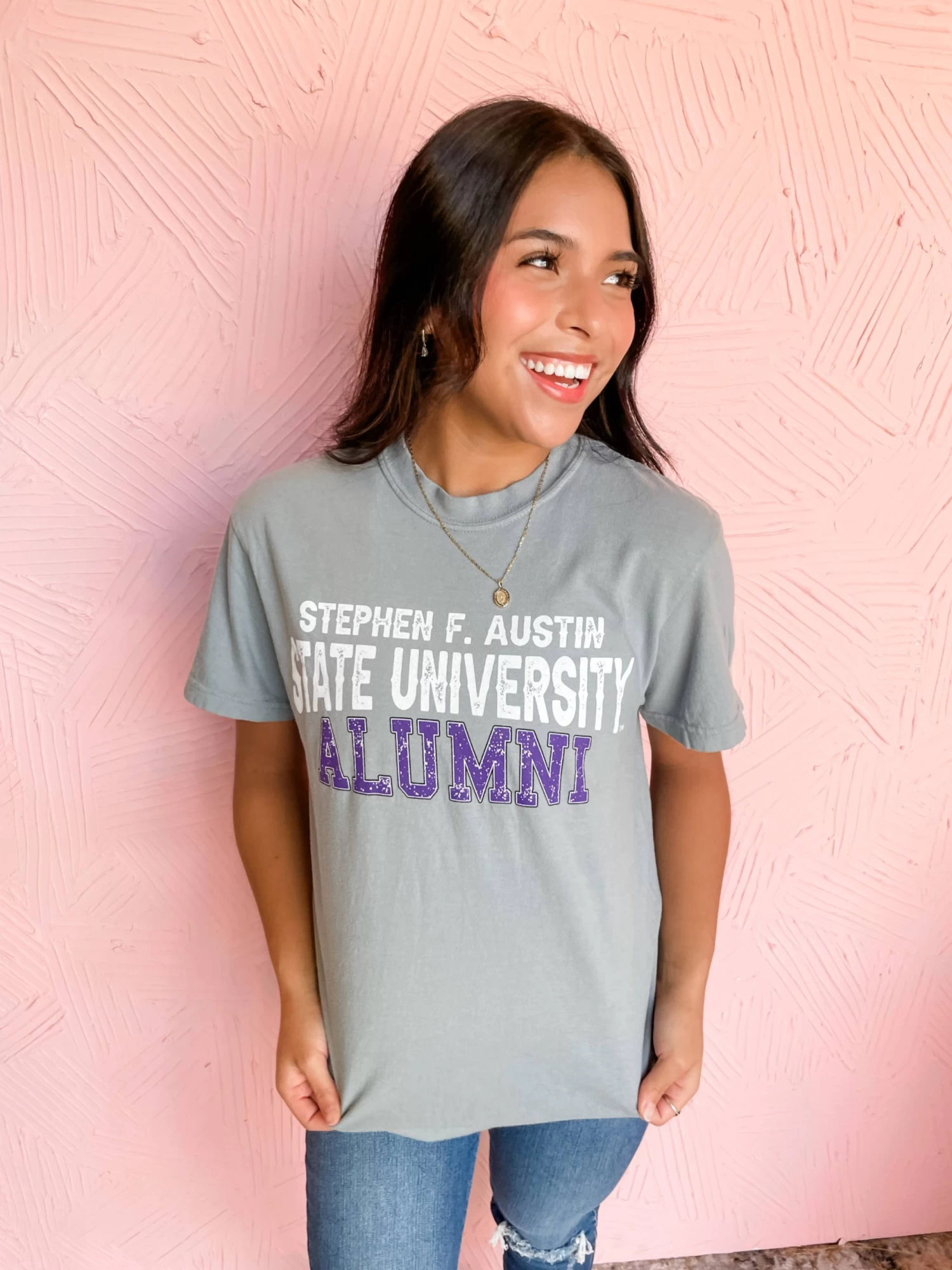 Calling all Jacks!! Our Rugged Alumni tee is bringing a traditional SFA design on a grey Comfort Colors top! Classic and timeless, this tee can be styled so many ways! Styled with our Clara Ultra High Rise Straight Leg Jeans.