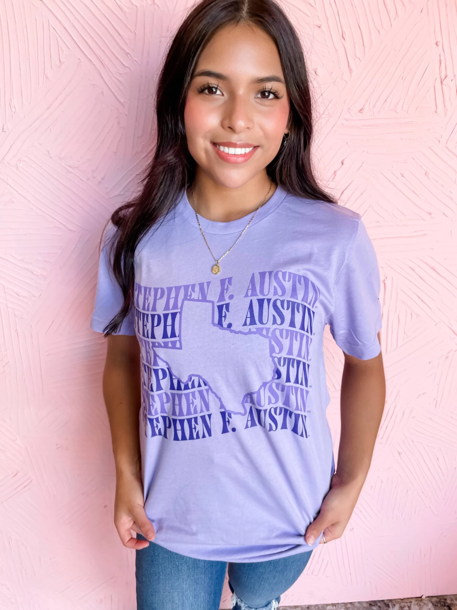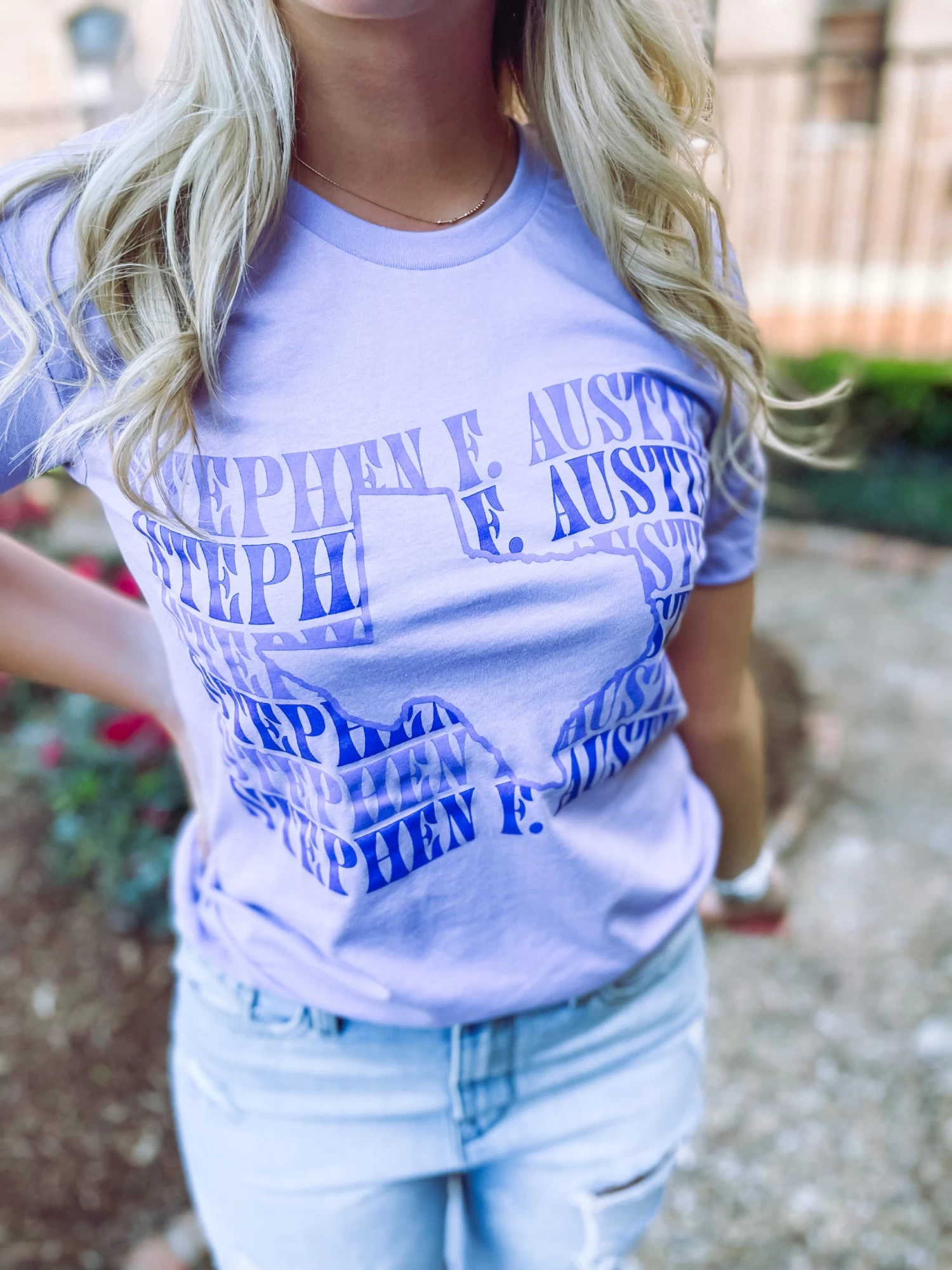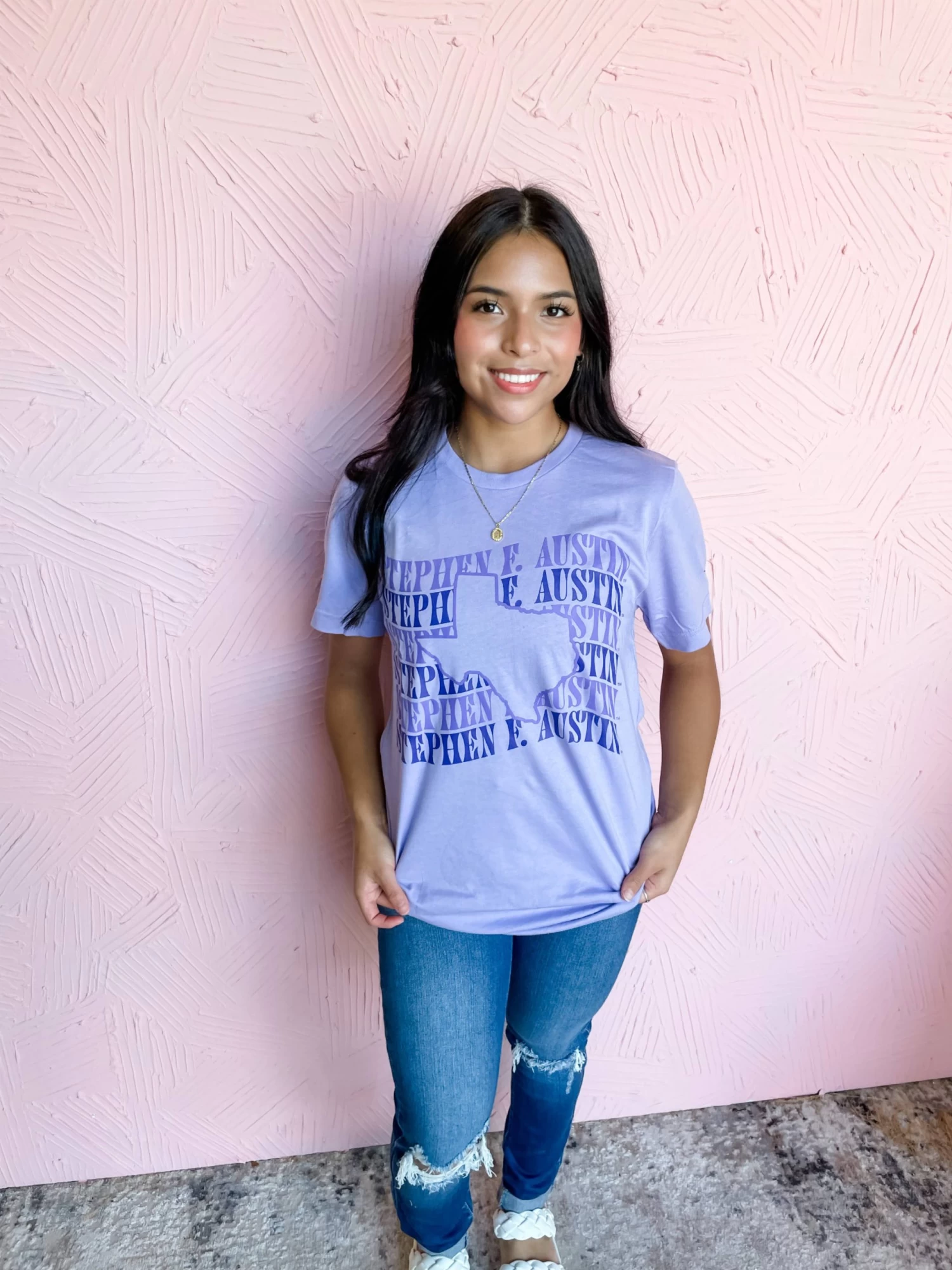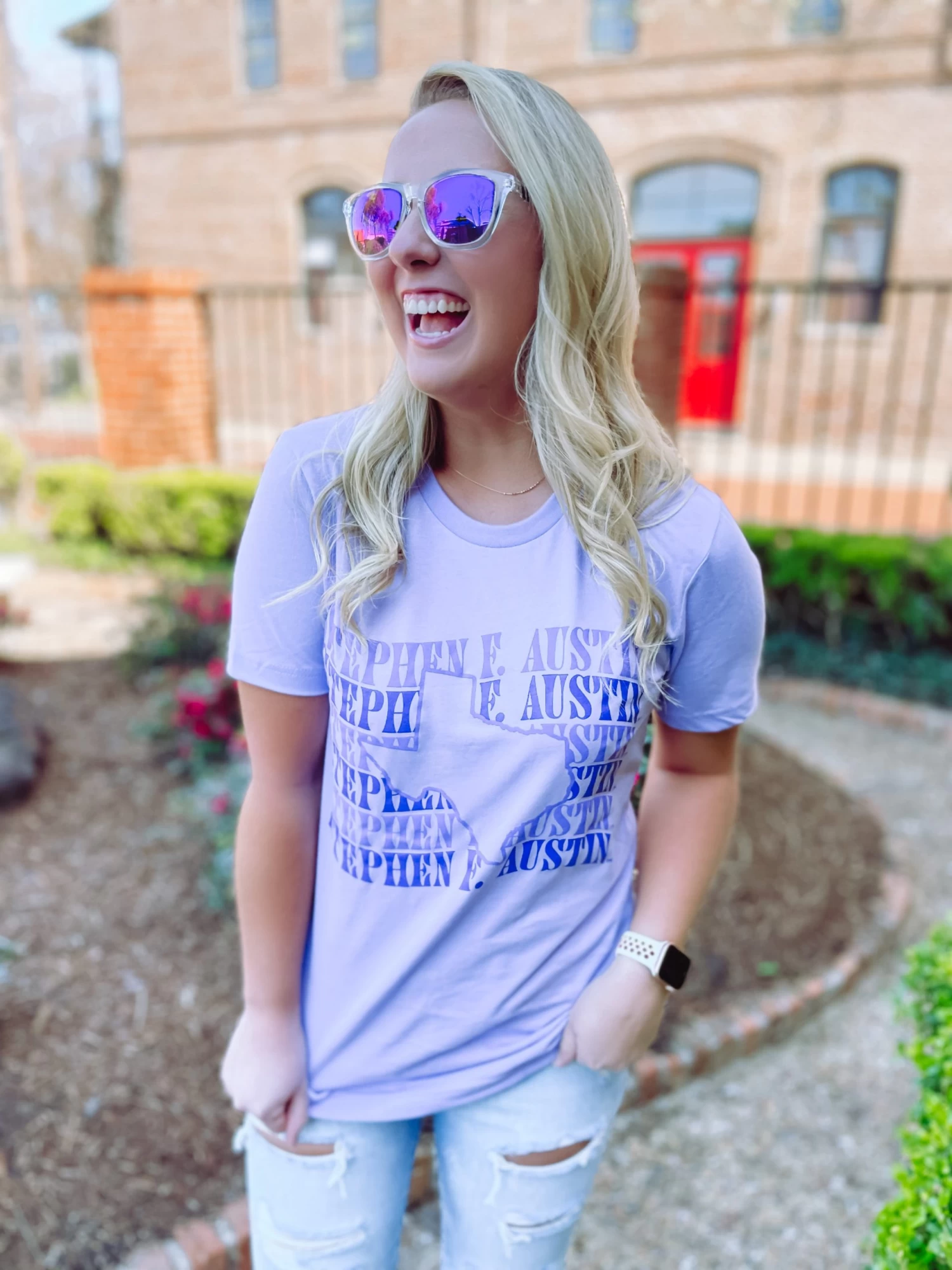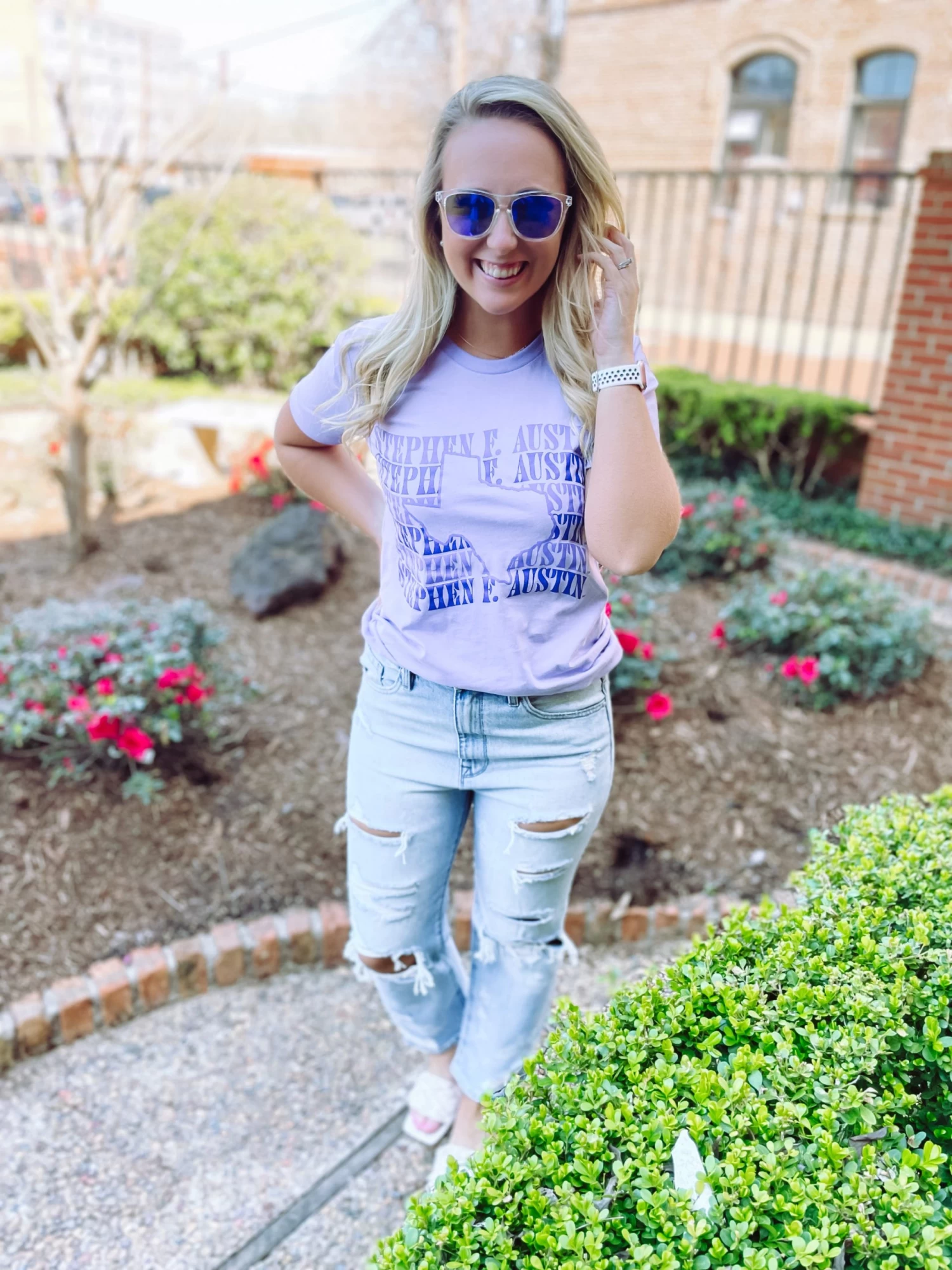 Calling all SFA peeps!! This tee is a trendy must have! Featured on an Atlantic Bella Canvas tee is our tone on tone SFA design! Styled with our Pixie Distressed High Waisted Rigid Vintage Straight Jeans.