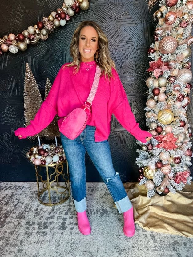 Styled With: Our Looking For You High Rise Cuffed Jeans, Ivy Bootie-Hot Pink, Toby Mini Woven Strap Crossbody Fuschia